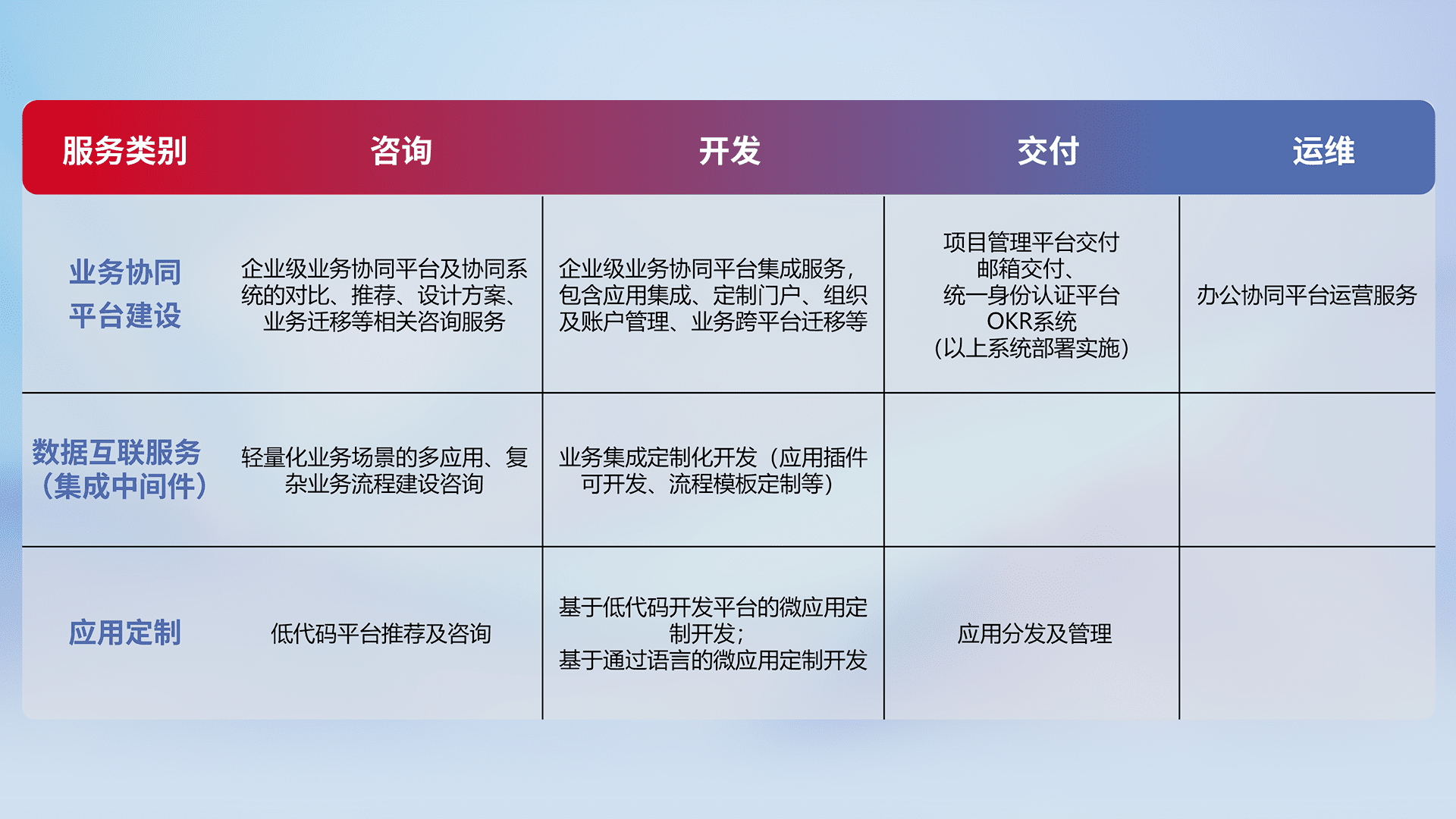 基于全代码&低代码的数字化应用系统开发及交付,满足特定业务场景的应用开发及集成,提升企业业务信息化及数字化能力。